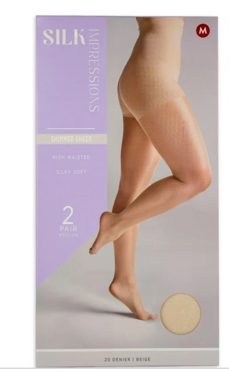 Add a new favorite to your hosiery collections with the new Sheer collection from Silk Impressions! Designed to be your strongest sheers yet with a high waist design and a smooth, flattering sheer finish. The new Silk Impressions Sheer to Waist tights come in a variety of colors so that you can find your perfect shade. Smooth control top panty with invisible flat seams for superior comfort from day to night. Shimmery leg is just what you need for that special occasion!  Now in a money-saving 4 pack!